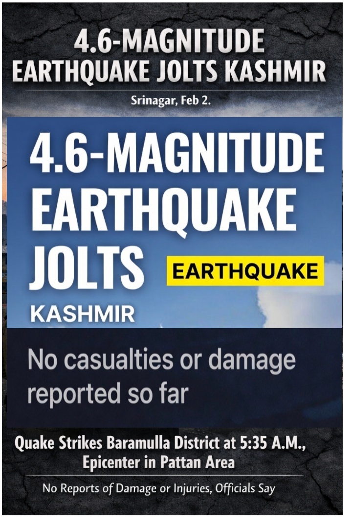 JAMMU & KASHMIR 4.6-Magnitude Earthquake Jolts Kashmir admin Feb 2, 2026 0 A 4.6-magnitude earthquake in Kashmir jolted parts of Baramulla district early Monday morning, officials said, triggering brief panic among residents… Read More
